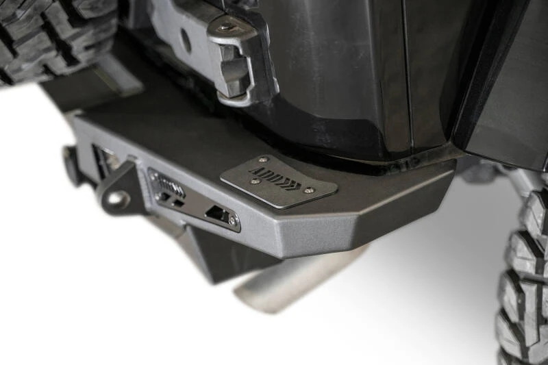 Die Stealth Fighter Heckstoßstange von Addictive Desert Designs bietet robusten Schutz für das Heck deines Jeep JK. Das flache Design sitzt nah am Fahrzeug und sorgt für eine elegante Optik. OEM-Funktionen wie Rückfahrsensoren, Anhängerkupplung und Anhängersteckdosenhalter bleiben erhalten. Zwei Halterungen für rückwärtige Cube-Lichter ermöglichen zusätzliche Beleuchtung. Verstärkte Clevis-Halterungen bieten Platz für 3/4" D-Ringe. Die Stoßstange ist mit dem originalen Reserveradträger oder dem Stealth Fighter Tire Gate kompatibel. Die Hauptstruktur ist in Hammer Black Pulverbeschichtung mit Satin Black Paneelen ausgeführt. Die Montage erfolgt komplett ohne Schweißen oder Schneiden. Hergestellt in den USA.