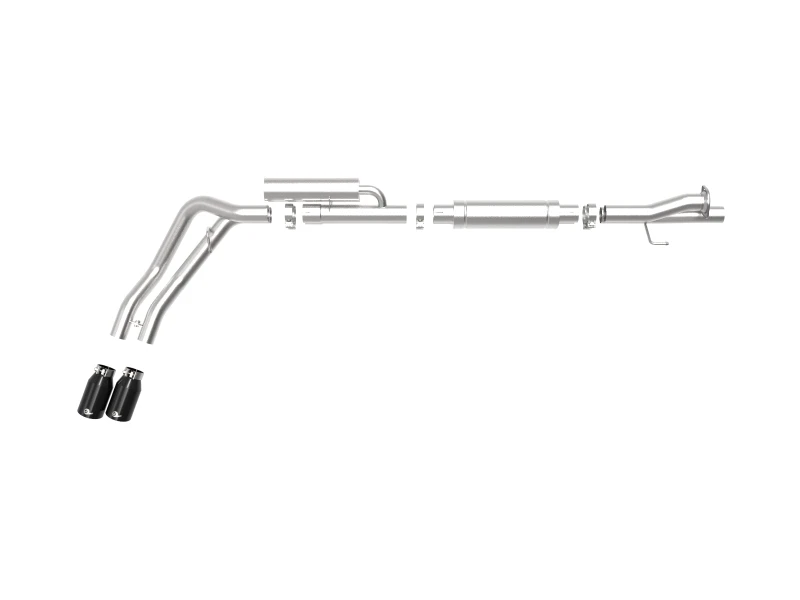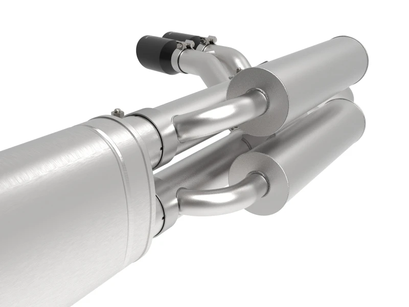 Die Anlage wird durch zwei 4-1/2"-Durchmesser-schwarze 304-Edelstahl-Endrohre mit einem lasergravierten aFe-POWER-Logo vervollständigt. Mit einer werkzeugartigen Flansch- und Hängerkonstruktion ist diese Anlage eine direkte Schraubmontage, die keine zusätzlichen Modifikationen erfordert.