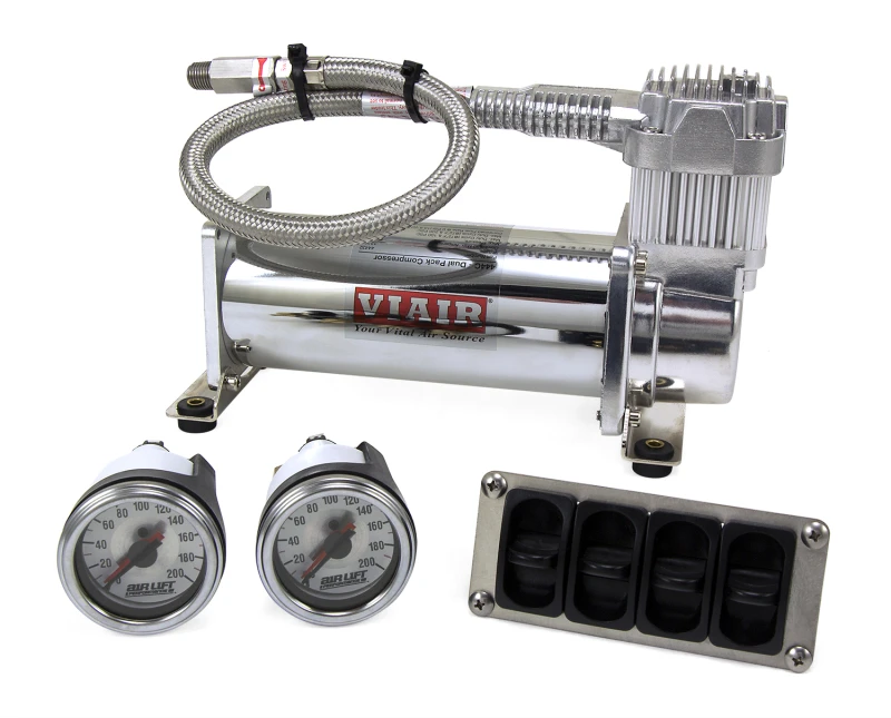 Das System verfügt über einen VIAIR 100% Duty-Zyklus 16444 Kompressor, 1/4? Luftleitung für präzise und ruhige Einstellung und ein attraktives Edelstahl-Schaltfeld.
