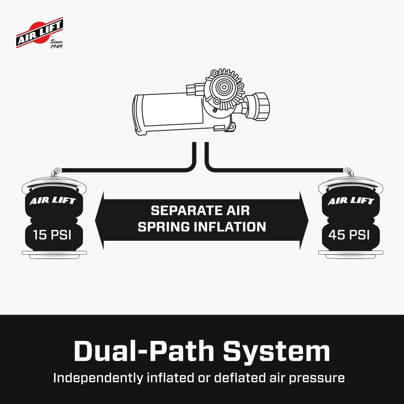 Das WirelessAir Tank + EZ Mount-Kit verfügt über einen leistungsstarken 444c-Schwerlastkompressor, einen 2-Gallonen-Pulverbeschichteten Reserve-Tank und ein Dual-Path-System, das Luftfedern auf individuelle Drücke aufpumpt oder ablässt. Dies ist ideal für Fahrzeuge, die ungleichmäßig verteilt Lasten tragen oder Anhänger, die schwer auf einer Seite beladen sind.