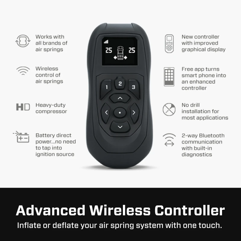 - Kostenlose iOS- und Android-Mobil-App zur Überwachung und Aufpumpen von Luftfedern