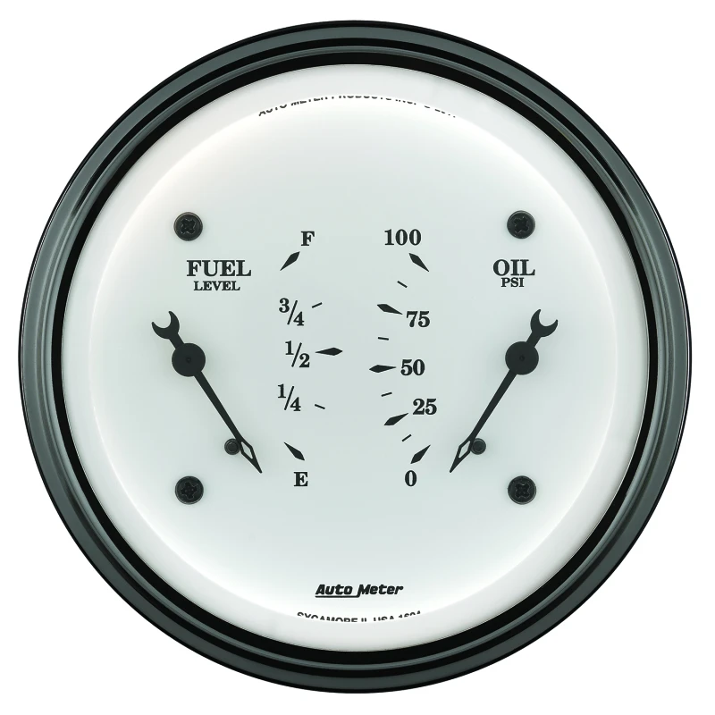AutoMeter-Doppelinstrument für Kraftstoff und Öl 3-3/8 Zoll, 240 Ohm(e) bis 33 Ohm(f) und 100PSI, elektrisch, Old Tyme Weiß
