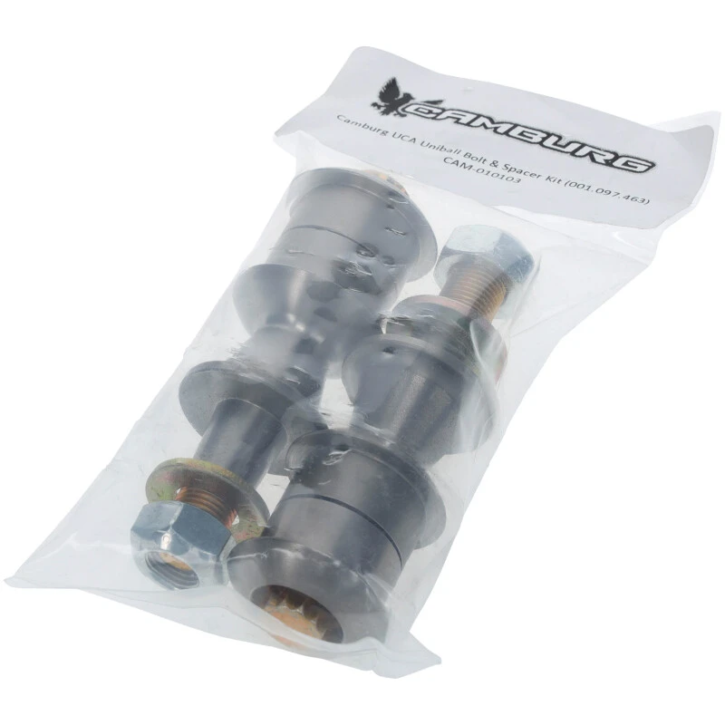 Dieses hochwertige Kit enthält alle notwendigen Schrauben, Muttern, Unterlegscheiben sowie die präzise gefrästen Edelstahl-Spacer für die Uniball-Gelenke an Camburg Upper Control Arms. Es ist speziell für den exakten Sitz an OEM- oder Camburg-Spindeln/Knuckles konzipiert und sorgt für eine sichere und langlebige Verbindung.