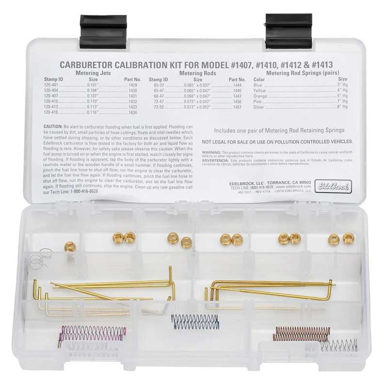 Mit dem Edelbrock Jet / Rod Kit für 1407/1410/1412/1413 kannst du deinen Vergaser auf das nächste Level bringen. Dieses Kit enthält eine Auswahl an Messstangen und Düsen, ein Paar Messstangen-Halterfedern und eine komplette Auswahl an Schrittschaltfedern.