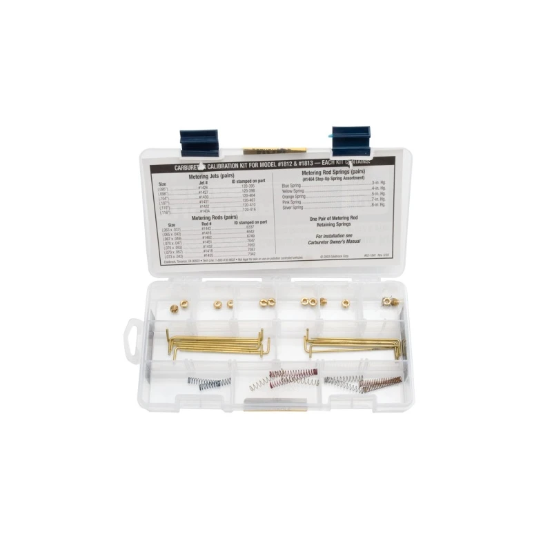 Erhöhe die Leistung Deines Motors mit dem Edelbrock Kalibrierungs-Kit für 1812/1813. Dieses umfassende Kit enthält eine Auswahl an Metering-Rods und Jets, ein Paar Metering-Rod-Haltesprings und eine komplette Auswahl an Step-Up-Springs.