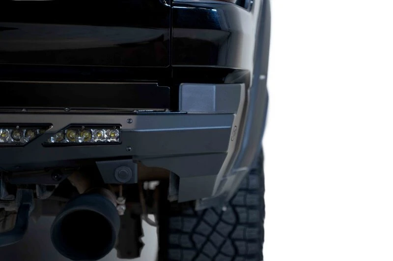 This Phantom Rear Bumper provides superior protection and style for your truck. Constructed from rugged plate steel, it features a modern box design that complements the truck's rear body style with a unique hammerhead style. The factory dual exhaust and tow hooks fit comfortably under the bumper, while sensor cutouts ensure full functionality of the parking/backup warning system. Mounting points for 10-inch SR LED light bars are integrated behind satin black aluminum accent panels.
