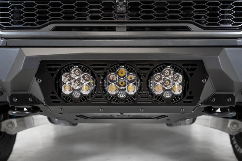 The Addictive Desert Designs Bomber Front Bumper is engineered for maximum protection and aggressive off-road styling. Its modern plate steel construction delivers superior strength, while the full 3/16-inch aluminum skid plate ensures a lighter weight than the original equipment manufacturer bumper. This bumper is available with mounts for either 4 Rigid 360 6-inch lights or 3 Baja Designs LP6 round lights, providing versatile lighting solutions for any adventure. Additional cube light mounts on each side offer supplementary illumination for enhanced visibility.