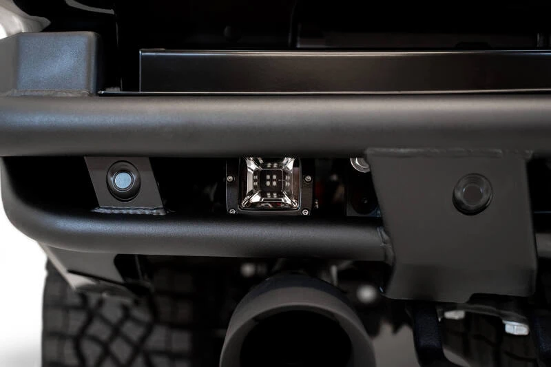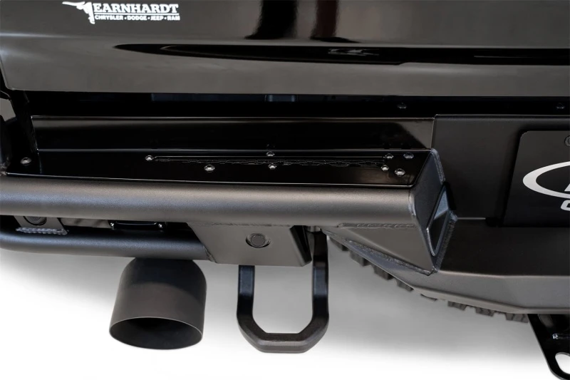 This rear bumper is designed to enhance the rear of the truck with a low-profile design, maximizing ground clearance while providing solid protection. It features a tubular steel frame combined with steel and aluminum plates, ensuring durability and style. The bumper retains OEM features such as parking sensors and tow hooks, and includes mounts for two rear-facing cube lights.