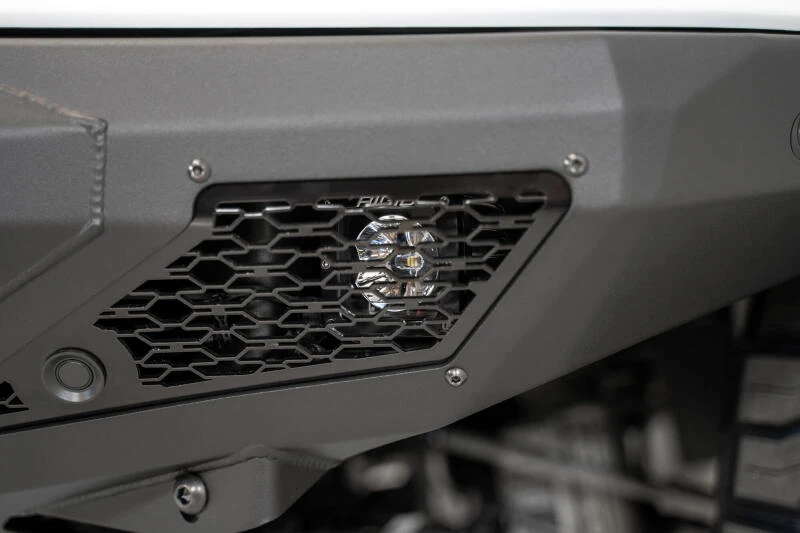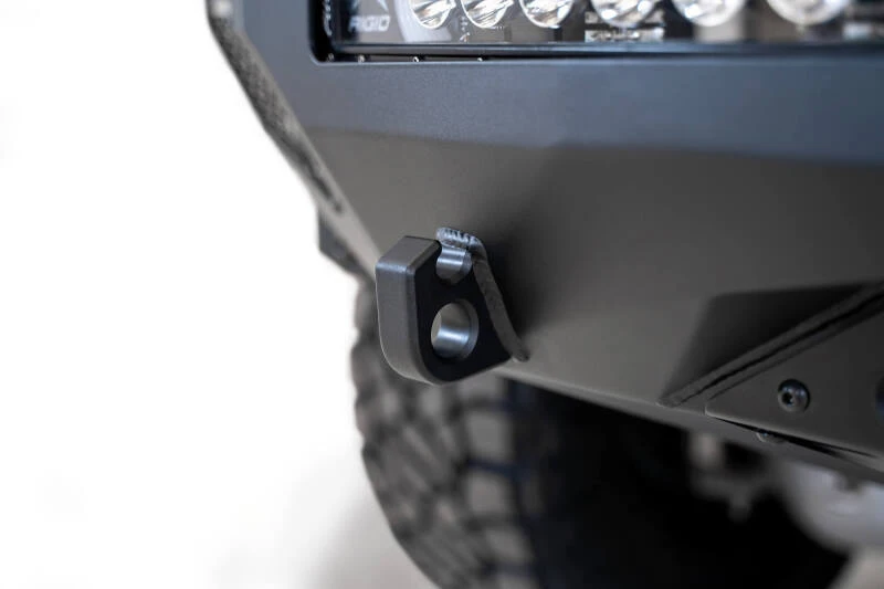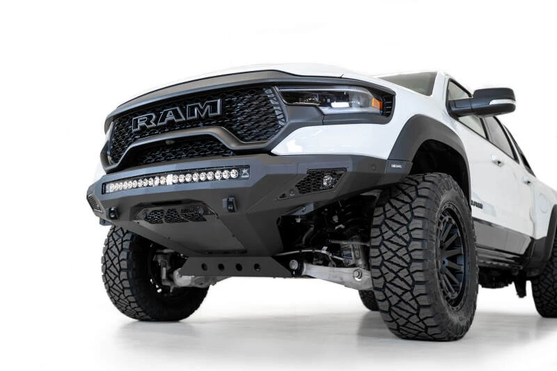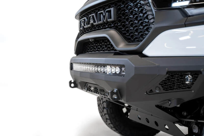 This low-profile plate steel bumper is designed to fit snugly around the front of your RAM TRX, following key bodylines for a factory-like appearance. It features a universal light mount system that accommodates a 40-inch curved light bar or up to 10 cube lights in the center, with additional cube light mounts behind each side panel. A full skid plate protects your shock reservoirs, and OEM amenities like parking sensors and marker lights are retained. Reinforced clevis mounts provide a secure mounting point for 3/4-inch D-Rings.