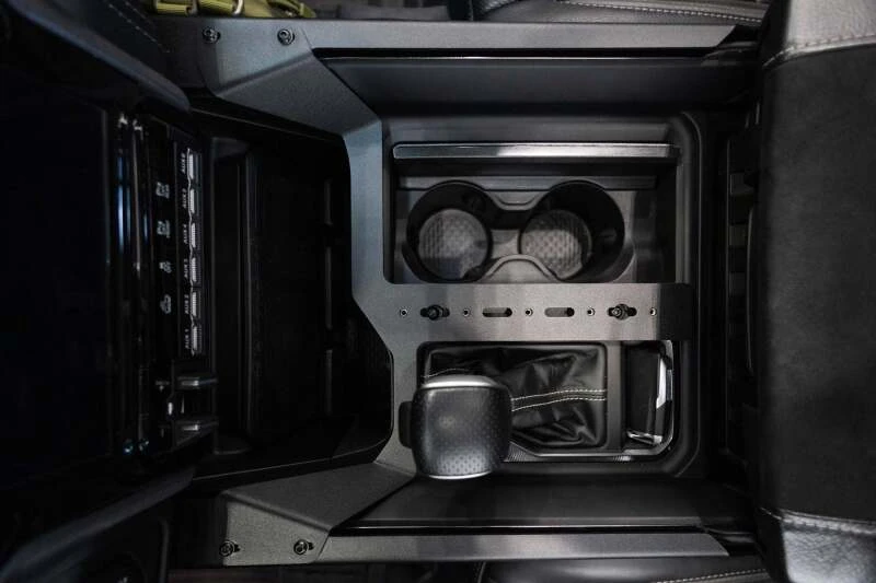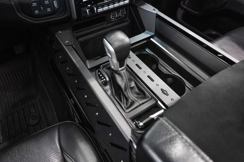 Designed for the 2021+ RAM 1500 TRX, these MOLLE panels and digital device bridge enhance storage and organization within the center console. The panels provide mounting points for gear like pouches, multi-tools, and holsters, while the bridge offers secure placement for devices such as smartphones and GPS units.