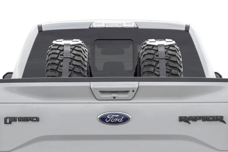 Designed for universal fitment, this tire carrier features a series of mounting holes that allow flexible placement anywhere in the truck bed. Slots at the front and rear support a Y-strap system for optimal tire retention, with two anchor points at the rear and one at the front. The carrier can be installed individually or paired side by side for multiple spares.