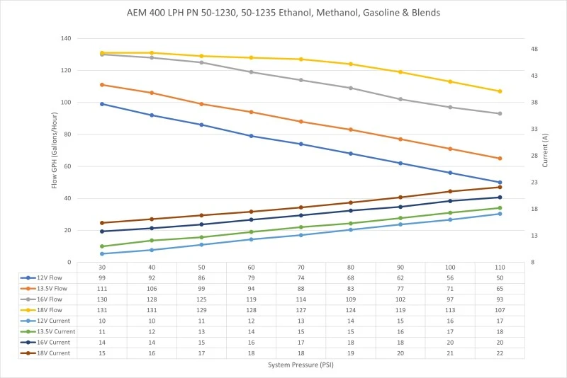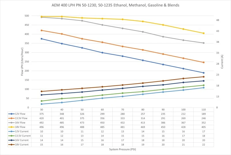 Each pump is individually flow tested and guaranteed to flow 400+ LPH (106 GPH) at 40 PSI (13.5V), supporting 1000+ horsepower on gasoline. The pump also maintains its high flow rate even as system pressure increases, flowing 330+ LPH at 70 PSI (13.5V) to support approximately 870 HP on gasoline.