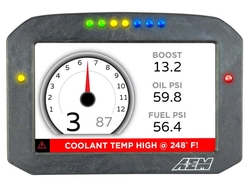 Experience the ultimate in digital dash technology with the AEM CD-7LG Carbon Logging Flush Digital Dash Display. This 7-inch diagonal screen display features a lightweight, flow-molded carbon fiber composite housing and is equipped with a 20Hz GPS receiver and antenna.