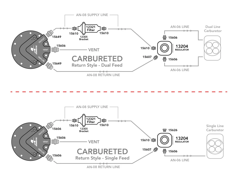 Unlock the full potential of your carbureted engine with the Aeromotive Phantom 340 Fuel System. This comprehensive kit includes everything you need to create a proper carbureted fuel system, from the Phantom Baffled Fuel Pump Kit to the carbureted bypass fuel pressure regulator, high flow billet fuel filter, and more.