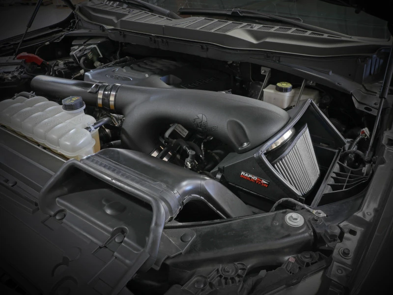 Unlock the full potential of your Ford F-150 with the aFe Rapid Induction Cold Air Intake System. This system features a 5-3/4" tall 360-degree radial flow air filter with oil-free Pro DRY S media, providing maximum convenience and great filtration efficiency.