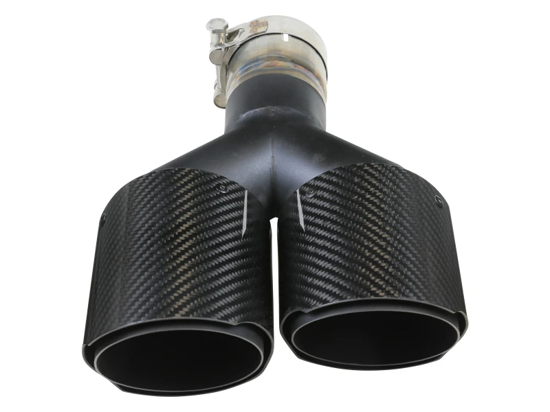 The aFe Takeda clamp-on exhaust tip enhances your vehicle's exhaust system with a sleek carbon fiber outer wall combined with a durable 304 stainless steel inner wall. Designed for 2.5-inch exhaust systems, this dual-wall tip features slotted air vents that reduce surface heat by allowing hot exhaust gases to dissipate, keeping the carbon fiber cooler during operation.