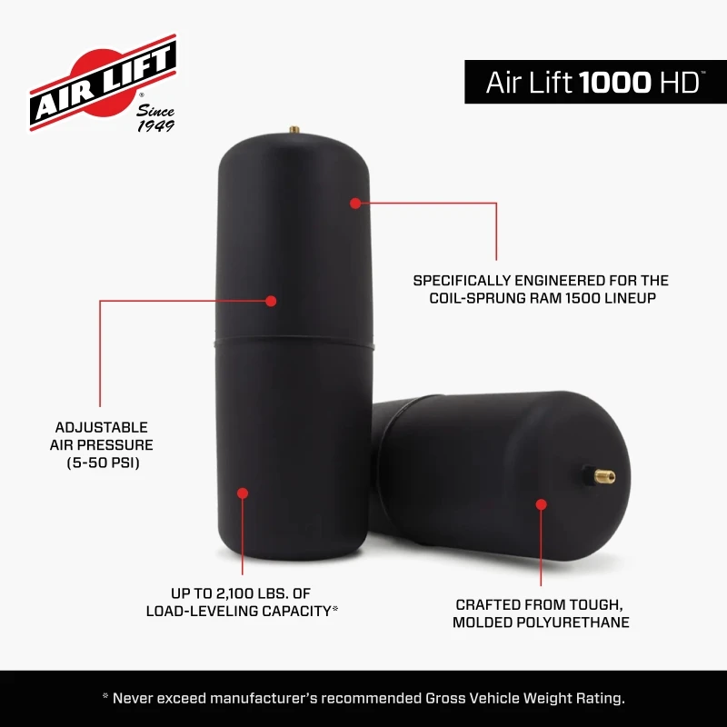 Working with the vehicle's existing suspension, Air Lift 1000 HD eliminates many of the problems frequently faced when towing or hauling heavy loads, including squat, poor headlight aim, unresponsive steering, trailer sway, body roll, and bottoming out. By properly leveling the load, squat is eliminated, braking is improved, and the vehicle is returned to a level and stable state, allowing users to tow and haul with safety and comfort.