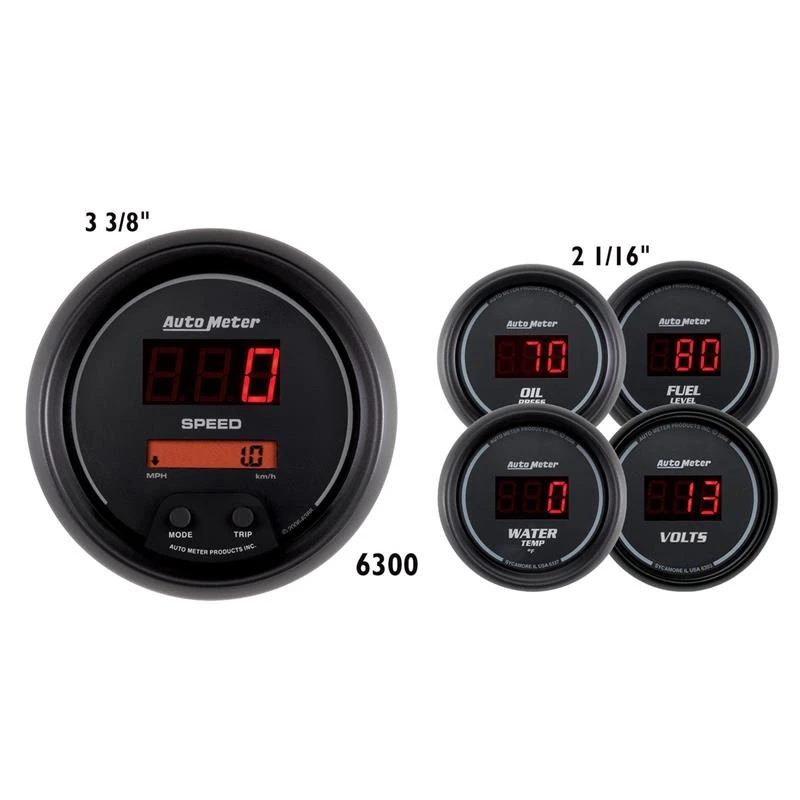 Get the ultimate driving experience with AutoMeter's 5-piece gauge kit. This comprehensive kit includes a speedometer, water temperature gauge, oil pressure gauge, fuel level gauge, and voltmeter, all featuring AutoMeter's E-Z View digital LED display system for maximum readability.