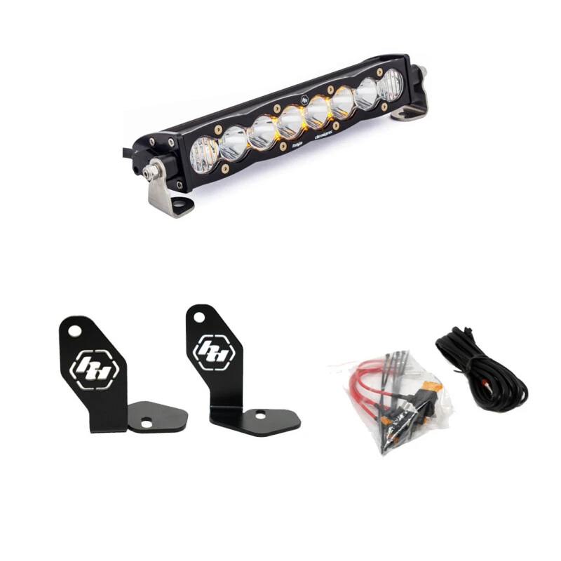 The Baja Designs S8 10in Hood Mount Kit is engineered specifically for the 2022-2023 Polaris RZR Pro R, delivering exceptional lighting performance with a sleek, low-profile design. This kit includes a powerful 10-inch S8 Driving/Combo LED light bar that projects 6,324 lumens while maintaining a low amp draw of 4.2 amps, ensuring efficient power consumption.