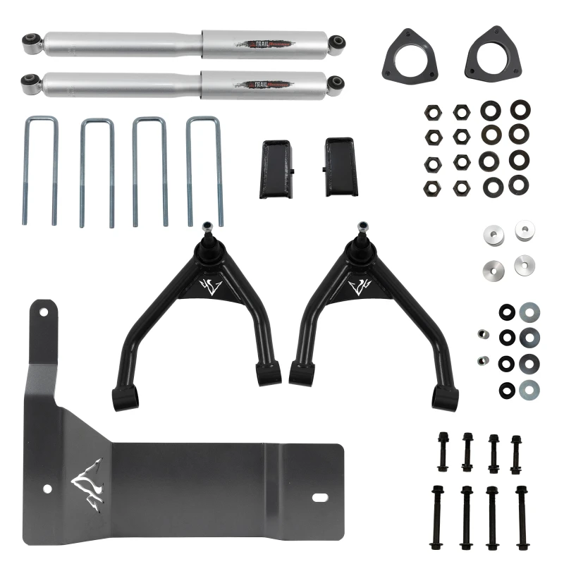 - Includes upper control arms, Trail Performance strut spacers, skid plate, rear blocks, and Rear Trail Performance shocks