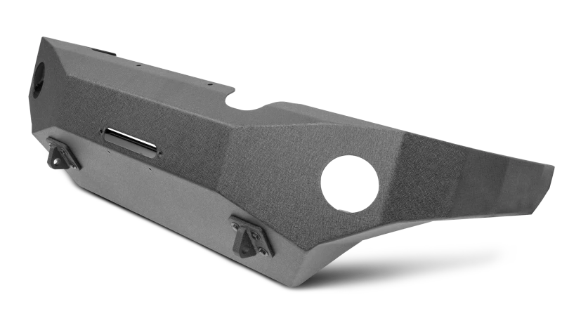 The bumper features a durable two-stage black powder coat finish with a heavy texture that resists corrosion and wear, ensuring long-lasting performance in harsh environments. It is designed to accommodate up to 4" round aftermarket lights, allowing for improved visibility during night or off-road driving.