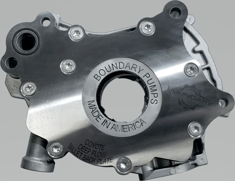 This Boundary oil pump assembly for 11-17 Ford Coyote V8 engines starts with the Ford OEM housing and is upgraded with the strongest, highest flowing hardware available. It features a patented vane-ported gearset with dual heat treatment for superior hardness and durability, ensuring optimal oil flow and performance at high RPMs.