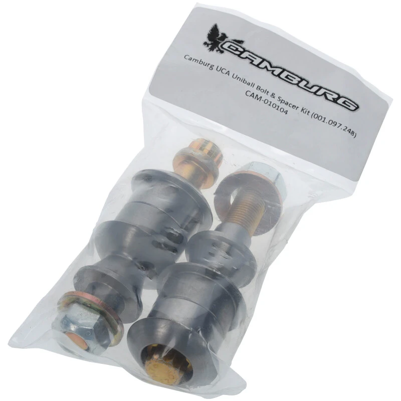 This Camburg Uniball Bolt & Spacer Kit provides the essential hardware needed for replacing uniball bolts and spacers on Camburg upper control arms. Engineered specifically for a precision fit with OEM or Camburg spindles and knuckles, the kit includes stainless steel top and bottom uniball spacers along with bolts, nuts, and washers designed for durability and reliability.