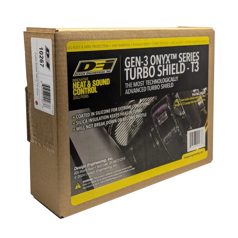 Take your turbocharged engine to the next level with the DEI Gen-3 Turbo Shield T3. This cutting-edge shield is designed to provide maximum heat protection and reduce turbo lag. The Onyx Black outer layer is coated in silicone to insulate and hold up under extreme conditions, while the multiple stainless steel and silica inner layers work together to keep heat in the turbo shield and turbo housing.