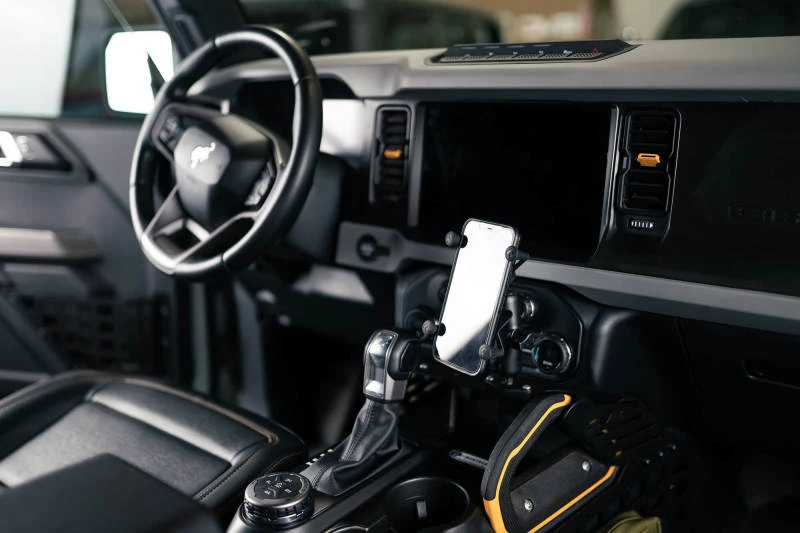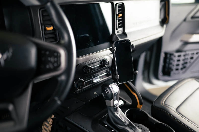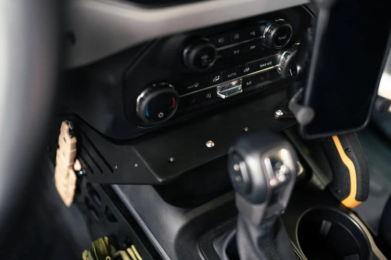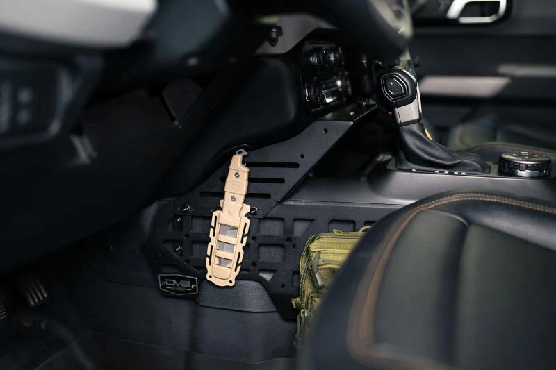 Enhance your off-road adventures with the DV8 Offroad Center Console Molle Panels & Bridge. Designed for the 2021-2023 Ford Bronco, these panels provide a convenient storage solution for molle pouches, multi-tools, sheaths, holsters, and other EDC gear. The bridge features PEM nuts compatible with RAM diamond-based digital device mounts, allowing you to keep your smartphone, GPS, or radio within easy reach.