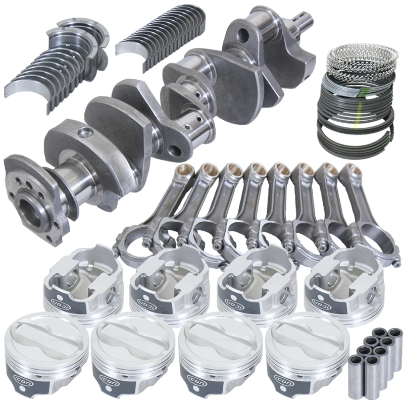 This Eagle rotating assembly is engineered for the Chevy LT1 350 engine, featuring a 3.750 inch cast crankshaft paired with 6.000 inch 5140 steel I-beam rods. The assembly includes forged 4032 inverted dome pistons with a -18cc volume and 4.000 inch bore diameter, optimized for street and strip performance. Plasma-moly file-fit rings and King SI rod and main bearings ensure durability and smooth operation under spirited driving conditions.