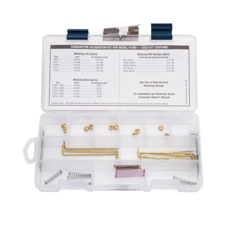 Take your carburetor to the next level with the Edelbrock Jet / Rod Kit for 1409. This calibration kit includes an assortment of metering rods and jets, one pair of metering rod retaining springs, and a complete assortment of step-up springs.