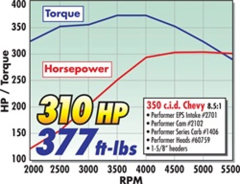 - Dyno tests showed gains of 5 hp and 9 ft-lbs. of torque over the Edelbrock Performer manifold #2101 on a 350 Chevy