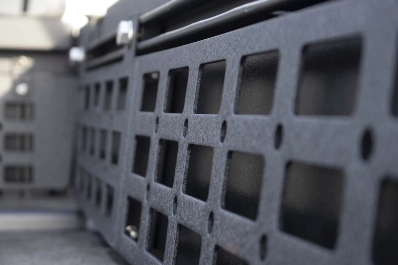Maximize your storage potential with the Fishbone Offroad Passenger Side Bed Molle Panel, designed specifically for the long bed of the 2016-current Toyota Tacoma. This panel is crafted from durable 10-gauge steel and features a black textured powder coat finish, ensuring both style and functionality. It supports Molle and tactical gear, allowing for endless customization options to keep your gear organized and within reach.