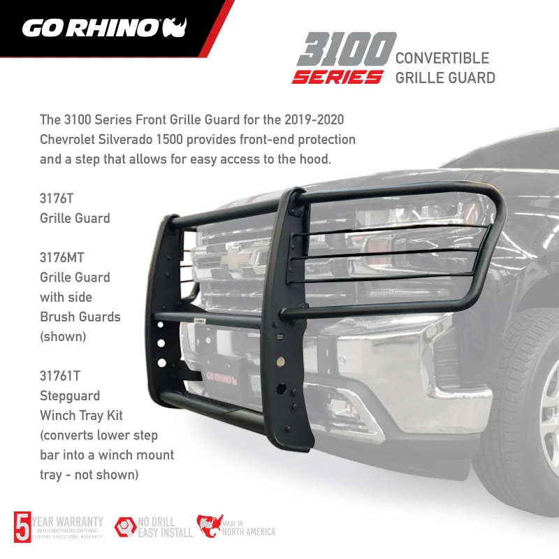 Protect the front of your Chevrolet Silverado 1500 with the Go Rhino 3000 Extreme Series StepGuard. This grille guard features a built-in step for easy access to the hood and brush guards to protect the headlights.