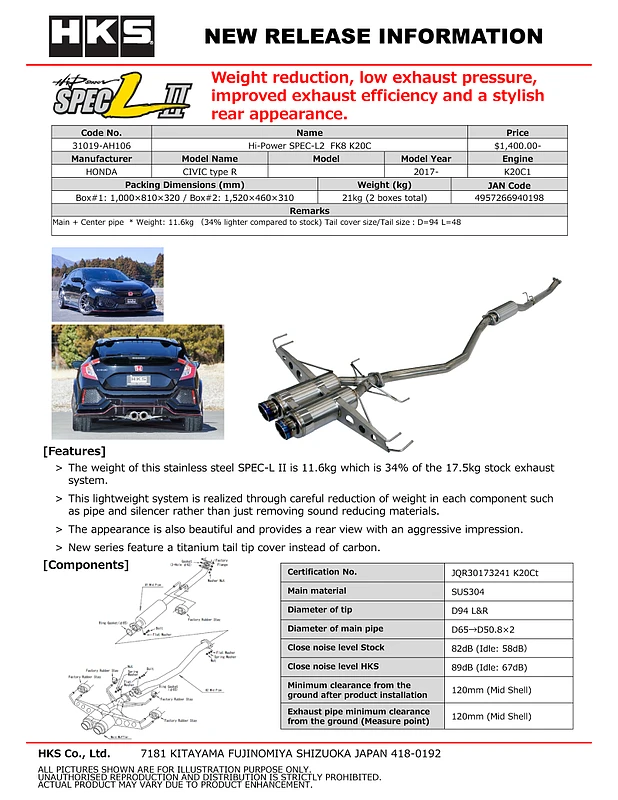 Engineered for maximum performance and weight reduction, the HKS Hi-Power Muffler SPEC-L2 is a premium catback exhaust system designed for the FK8 Honda Civic Type R equipped with the K20C engine. Utilizing advanced manufacturing techniques and high-grade materials, this exhaust delivers improved exhaust efficiency, a sporty sound profile, and a striking visual presence.