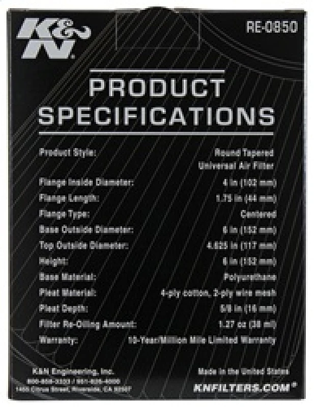 K&N Universal Air Filter (4in. Flange / 6in. Base OD / 4-5/8in. Top OD / 6in. Height)