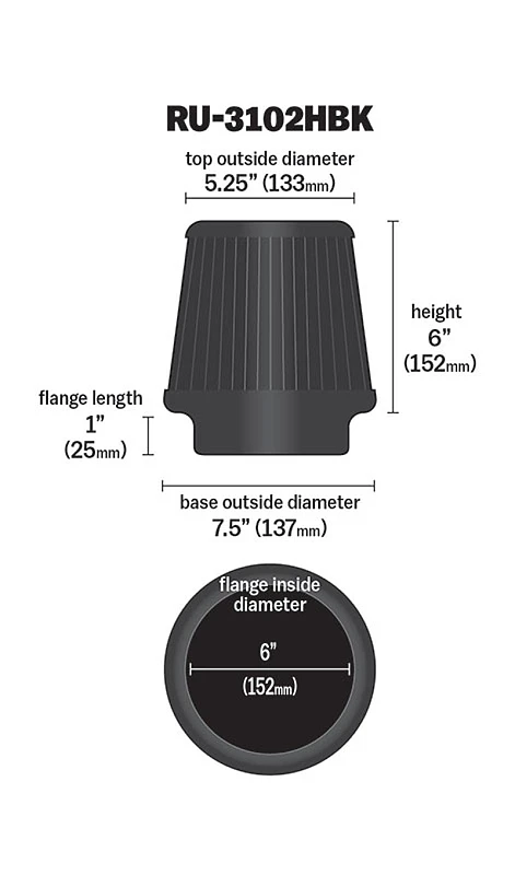 K&N Universal Rubber Filter Round Tapered 6in Flange ID x 7.5in Base OD x 5.25in Top OD x 6in Height