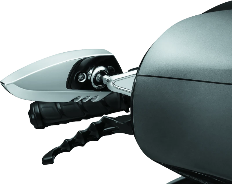 Enhance the appearance of your Harley-Davidson® bagger with the Kuryakyn Fairing Mount Scythe Mirror in chrome. Featuring a distinctive scythe-shaped mirror head cast from durable A380 aluminum, this mirror combines aggressive styling with functional precision. The machined stainless steel ball and nylon socket ensure smooth pivoting for easy adjustability and firm positioning.
