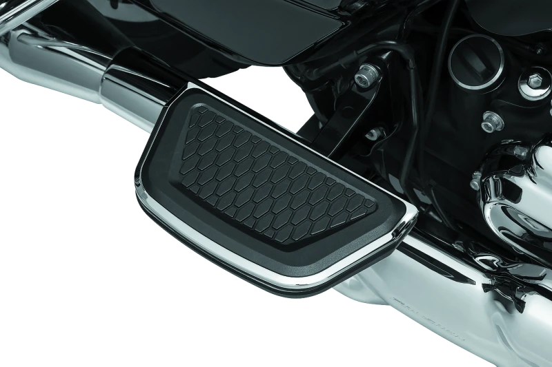 Upgrade your motorcycle passenger floorboards with the Kuryakyn Hex Passenger Board Inserts in chrome finish. These inserts are designed as direct replacements for stock pads, combining style and functionality. They feature molded EPDM rubber for enhanced vibration dampening and comfort during rides, paired with a beveled A380 aluminum trim that delivers a striking chrome appearance.