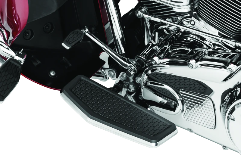 The Kuryakyn Hex Shift Peg combines robust construction with stylish design, crafted from heavy-duty aluminum with a chrome finish. Its angular housing and smooth beveled edges add visual depth, while premium EPDM rubber inserts featuring a geometric hex pattern provide superior traction, durability, and vibration-dampening comfort. Equipped with splined adaptors, this shift peg allows precise angle adjustments for optimal rider ergonomics.
