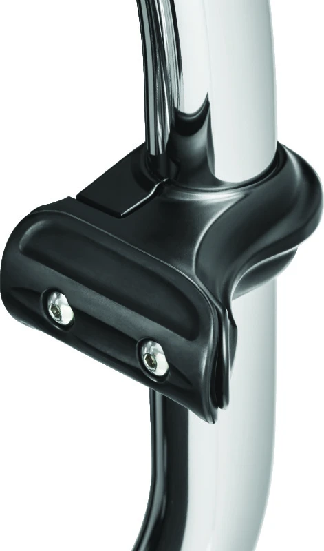 These minimalist toe rest mounts attach directly to the engine guard, providing a comfortable cruising option by allowing the operator's heel to rest on the floorboard with the front of the foot positioned just behind the engine guard. Designed to fit stock 1-1/4 inch round engine guards, these satin black toe rest cruise pegs offer a sleek and functional upgrade for riders seeking enhanced comfort on long rides.