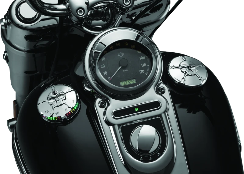 This Zombie LED Fuel & Battery Gauge combines menacing style with practical function. Featuring a chrome-plated, die-cast aluminum housing with the sinister Zombie™ skull design, it provides clear LED indicators for monitoring fuel levels and battery voltage. Designed for straightforward installation, it uses hassle-free plug-and-play wiring, making it an ideal upgrade for motorcycles requiring precise fuel and battery status monitoring.