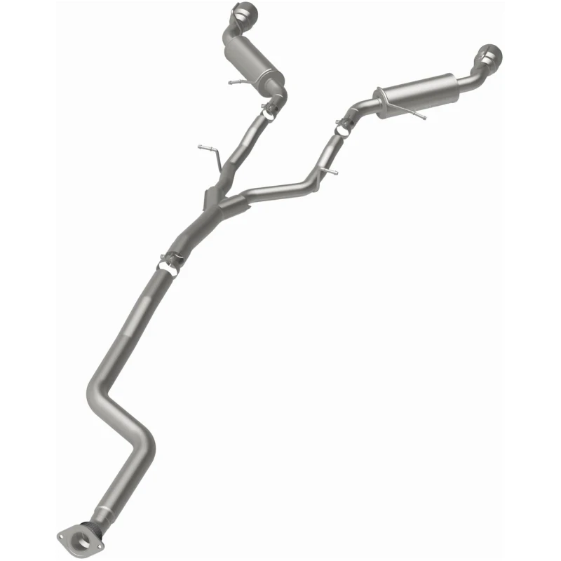Featuring mandrel-bent 3in main piping and two straight-through mufflers, this exhaust system is built to last and provides a smooth, deep tone. The dual split rear exit with 4.5in polished welded-on double wall angle cut folded edge tips adds a sporty touch to your vehicle's appearance.