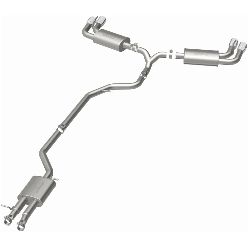 Featuring mandrel-bent 2.5in. main piping and 3 Straight-Through mufflers, this exhaust system is built to last and provides a smooth, deep tone. The Quad Split Rear exit with 3.5in. Polished Weld-On-Double Wall-Angle Cut-Folded Edge tips adds a sporty touch to your vehicle's appearance.