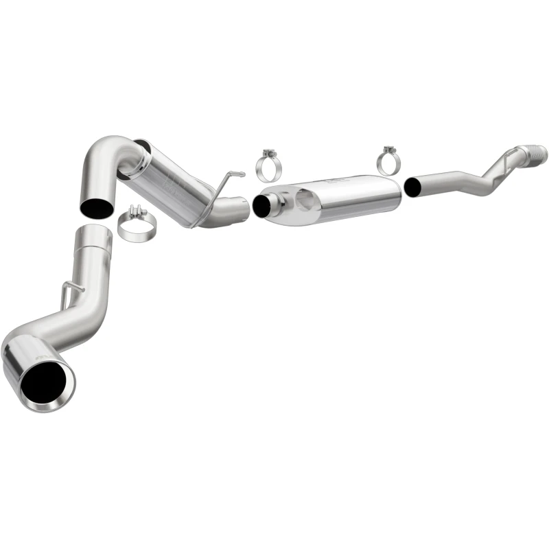 Unleash the full potential of your truck with the MagnaFlow Street Series 15329 cat-back exhaust system. This system features fast-flowing, mandrel-bent 4in. main piping and 2 straight-through mufflers, ending in a single passenger side rear exit with 5in. polished welded-double wall-angle cut-rolled edge tips.