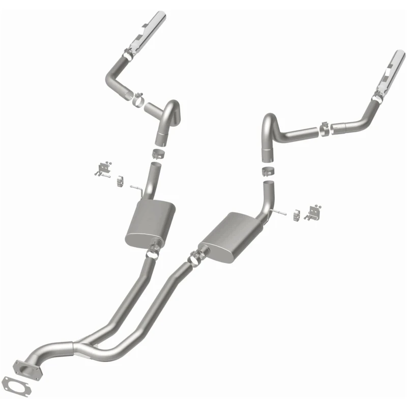 - Dual Split Rear exit with 3" Polished Clamp-On Single Wall Angle Cut Cut Edge tips