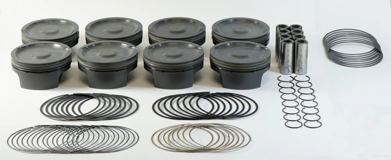 This Mahle MS Piston Set is engineered for high-performance GM LS engines, specifically designed for the LS 427ci application. Featuring a 4.125 inch bore and 4.000 inch stroke, these forged pistons come with a 6.125 inch connecting rod and .927 inch wrist pin diameter. The pistons have a -25cc dish volume and achieve a compression ratio of 9.9:1, optimized for LS7 style heads.