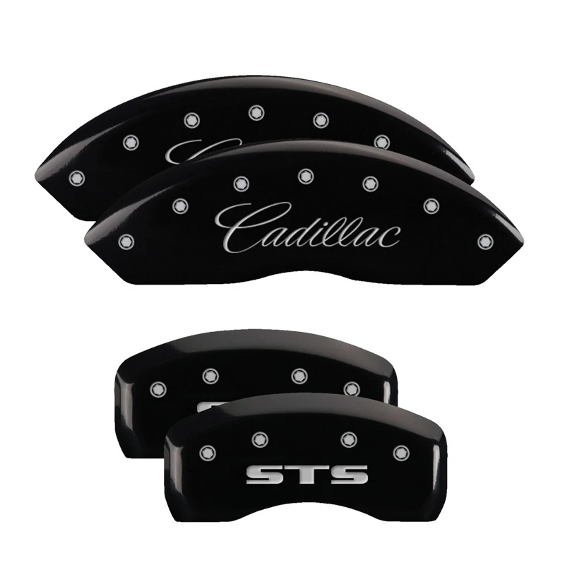 MGP 4 Caliper Covers Engraved Front Cursive/Cadillac Engraved Rear STS Black finish silver ch