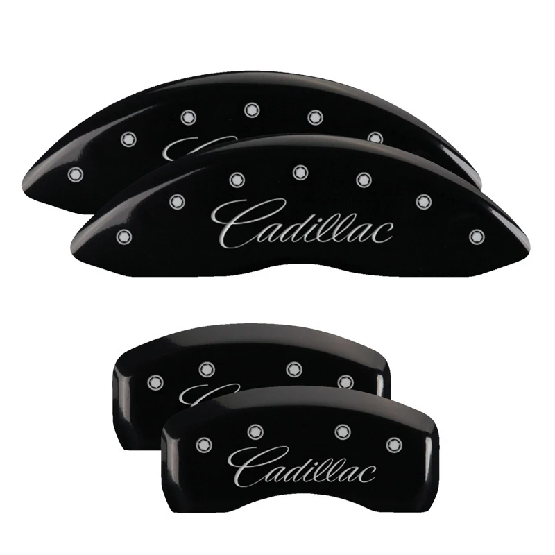 Elevate your Cadillac's style with MGP Caliper Covers, expertly designed to conceal unsightly brake calipers. These premium aluminum covers boast a high-quality powder coat finish in sleek black, complete with silver Cadillac engravings in cursive script.