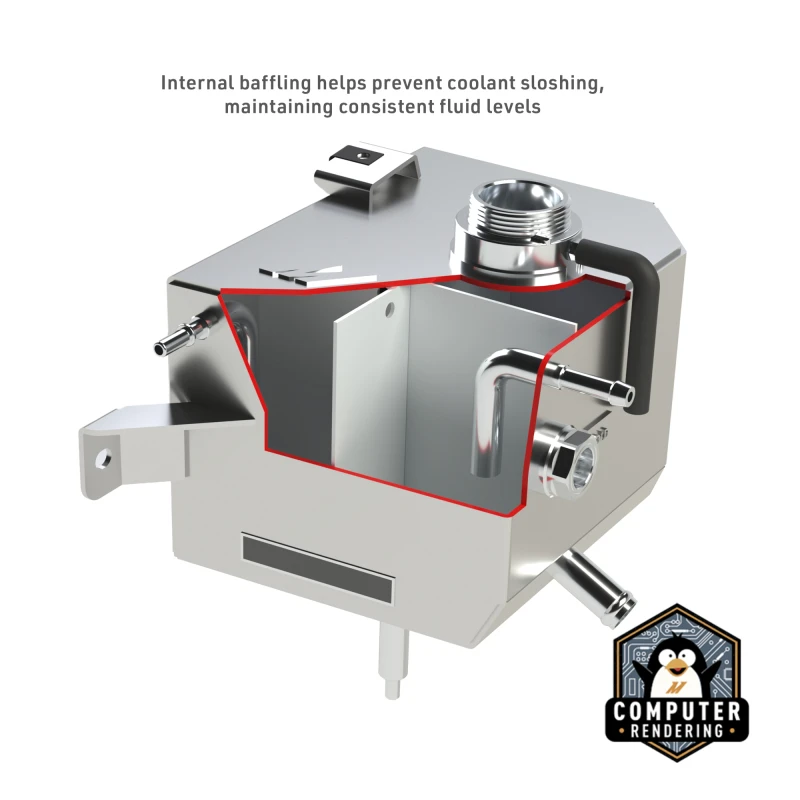 Featuring a high-visibility sight glass and stamped cold-fill line, checking your coolant level has never been easier. The available micro-wrinkle black powder coated or polished finishes suit any style, and the fill neck accepts the stock expansion tank cap for easy maintenance.